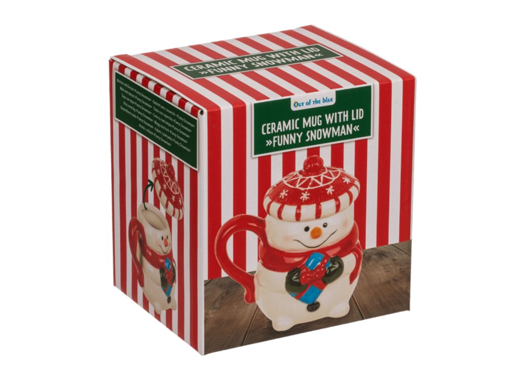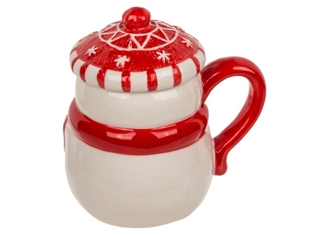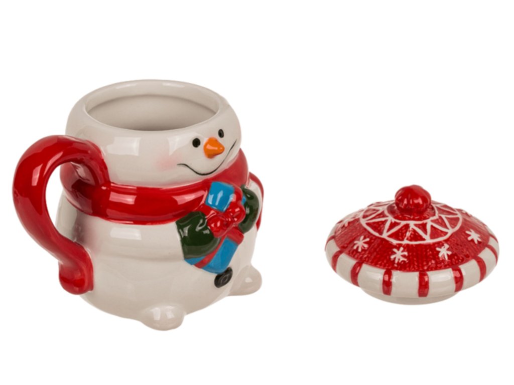 Roztomilý a veselý hrneček v designu sněhuláka. Červené víčko ve tvaru čepice udrží váš nápoj déle teplý.