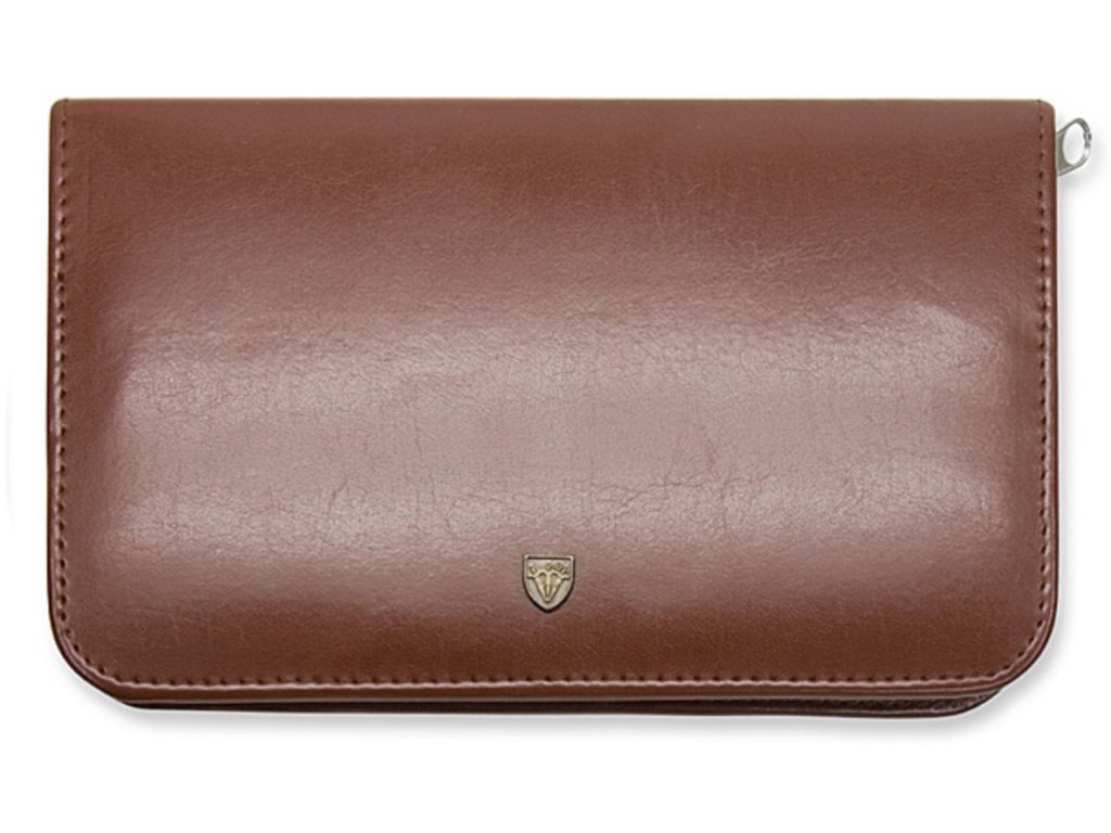 Elegantní hnědé pouzdro je vyrobeno ze syntetické kůže, zapínání na zip s kovovým jezdcem.